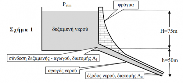 μεταξύ του σημείου εισόδου και του σημείου εξόδου στον αγωγό είναι ίση με h=50m. Το νερό στο φράγμα θεωρείται ιδανικό ρευστό και έχει πυκνότητα ρ=1000kg/m3, η επιτάχυνση της βαρύτητας δίνεται g=10m/s2 και η ατμοσφαιρική πίεση είναι ίση με Patm=105Pa. Η διατομή του αγωγού στην έξοδο του νερού είναι ίση με Αο=1m2, ενώ στο σημείο σύνδεσης δεξαμενής – αγωγού, η διατομή του αγωγού είναι ίση με Α1.