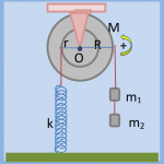 Στο σχήμα απεικονίζεται μια τροχαλία μάζας Μ και ακτίνας R, που φέρει εγκοπή ακτίνας r ,όπου έχουμε τυλίξει πολλές φορές νήμα αβαρές μη εκτατό, στο άλλο άκρο του οποίου έχουμε προσδέσει ελατήριο σταθεράς k που το κάτω άκρο του είναι δεμένο στο δάπεδο. Στο εξωτερικό μέρος της τροχαλίας ,ακτίνας R, έχουμε τυλίξει πολλές φορές όμοιο νήμα, το άκρο του οποίου είναι δεμένο σώμα μάζας m1 , το οποίο συνδέεται με όμοιο νήμα με άλλο σώμα m2