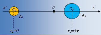 Ένα διπλό σύστημα αστέρων αποτελείται από δύο σφαιρικά άστρα, που κινούνται με ομόρροπες γωνιακές ταχύτητες σε κυκλικές τροχιές γύρω από ένα σημείο Ο που ονομάζεται κέντρο μάζας. Ας υποθέσουμε ότι ένα τέτοιο σύστημα αποτελείται από το άστρο Α1, κέντρου Ο1 και μάζας Μ1 = Μ και το άστρο Α2, κέντρου Ο2 και μάζας Μ2 = 3Μ, όπου Μ = 3∙1030kg.Η απόσταση μεταξύ τους (διάκεντρος) είναι r = 2∙1010m και η σταθερά της παγκόσμιας έλξης G = 6,67∙10-11 Nm2/kg2. Υποθέτουμε αμελητέα οποιαδήποτε άλλη δύναμη εκτός της μεταξύ τους βαρυτικής έλξης.