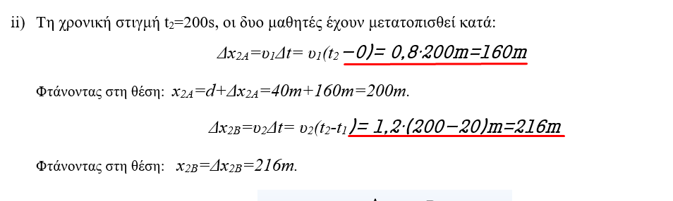 - Να υπολογιστούν οι μετατοπίσεις των δύο μαθητών τη χρονική στιγμή t2=200s. Ποια απόσταση μεταξύ των μαθητών την στιγμή αυτή;