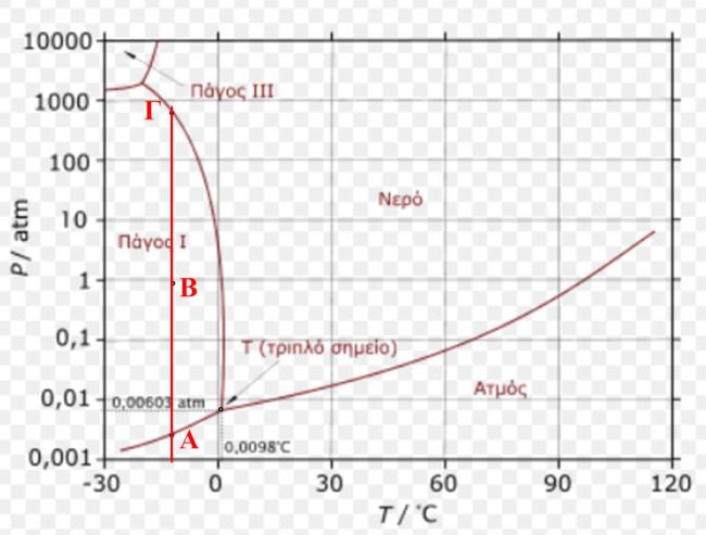 Έστω ότι ο πάγος της εικόνας βρίσκεται σε περιβάλλον θερμοκρασίας -15 Κελσίου, όπως περίπου και οι καταστάσεις Α, Β & Γ του διαγράμματος φάσεων που παράθεσες. Στο εσωτερικό του είχε προ-τοποθετηθεί μεταλλικό σύρμα. Κάτω από το σύρμα φυλακίστηκε μεταξύ των παγοκρυστάλλων η κατάλληλη ποσότητα ατμού, ώστε να έχει πίεση και θερμοκρασία όμοιες με αυτές που επικρατούν στην κατάσταση Α (-15 Κελσίου, 0,005 Atm). Επειδή ο ατμός βρίσκεται σε συνθήκη που εκφράζεται από την καμπύλη εξάχνωσης, τελεί σε ισορροπία με τον πάγο.