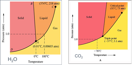 Σε χαμηλότερες θερμοκρασίες στην περίπτωση του ύδατος, απαιτείται μεγαλύτερη τάση, σε αντίθεση με τα τυπικά υλικά που η αύξηση της τάσης προκαλεί πλησίασμα των μοριακών δομών και συνακόλουθη αύξηση των διαμοριακών δυνάμεων. Οπότε, αυτά τήκονται σε υψηλότερες θερμοκρασίες. Ο Γιώργος το έχει ήδη αναφέρει για την περίπτωση του μολύβδου. Εγώ τον ενισχύω, παραθέτοντας δυο διαγράμματα, του νερού και του διοξειδίου, για σύγκριση.
