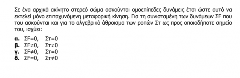 Διονύση εξαιρετική!!!. Με προβληματίζει αυτό που λές ότι σε εξετάσεις ενδέχεται να δεχτούν και τις δύο λύσεις ως σωστές . Το σχολικό βιβλίο εξηγεί την ισορροπία και δικαιολογεί το "ως προς οποιοδήποτε σημείο". Θα μου πείς δεν λέει τίποτε για επιταχυνόμενο (μεταφορικά) και μή στρεφόμενο στερεό. Τότε ένα τέτοιο θέμα θα πρέπει να θεωρηθεί εκτός ύλης(;). Πάντως δεν μπορώ να χωνέψω ότι μπορεί να γίνει δεκτή μια λανθασμένη λύση. Καλό απόγευμα