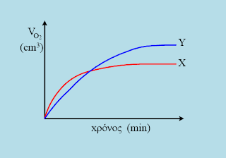 Στην καμπύλη Χ του ακόλουθου γραφήματος παριστάνεται ο όγκος του οξυγόνου (Ο2), ο οποίος εκλύεται κατά τη διάρκεια της καταλυτικής αποσύνθεσης διαλύματος υπεροξειδίου του υδρογόνου 1 Μ σε συνάρτηση με τον χρόνο. Η αντίδραση είναι: