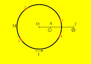 Ας δούμε λοιπόν το παραπάνω σχήμα, σε κάτοψη όπου ο κυκλικός αγωγός διαρρέεται από ρεύμα Ι δημιουργώντας μαγνητικό πεδίο, όπου στα σημεία Α και Γ η ένταση του μαγνητικού πεδίου έχει σημειωθεί στο σχήμα.