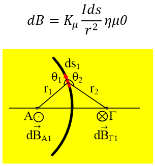 Εξαιτίας του στοιχειώδους τόξου ds1 δημιουργείται στα σημεία Α και Γ μαγνητικό πεδίο, όπου ο νόμος Βiοt-Savart δίνει για το μέτρο της έντασης: