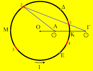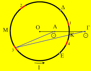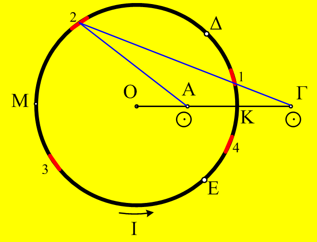 Αν φέρουμε από το Γ τις δύο εφαπτόμενες στον κυκλικό αγωγό, τότε μπορούμε να χωρίσουμε τον κύκλο σε 4 τόξα, το ΚΔ, το ΔΜ, το ΜΕ και το ΕΚ. Ας ασχοληθούμε τώρα μόνο με το τόξο ΚΔ.