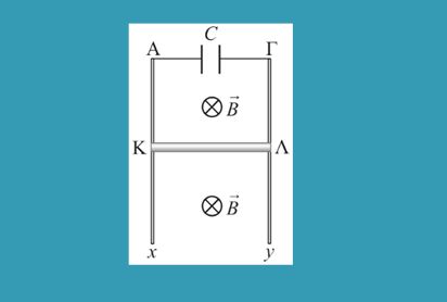 Δύο κατακόρυφα και παράλληλα σύρματα Αx και Γy έχουν μηδενική αντίσταση και στα πάνω άκρα τους, Α και Γ, συνδέεται ένας επίπεδος πυκνωτής χωρητικότητας C=400 μF. Ευθύγραμμος αγωγός ΚΛ, που έχει μήκος l=0,5 m και μάζα m=10 g, μπορεί να ολισθαίνει έτσι ώστε να είναι συνέχεια κάθετος στους αγωγούς Αx και Γy με τα άκρα του, Κ και Λ, σε συνεχή επαφή με αυτούς. Κάθετα στο επίπεδο των αγωγών υπάρχει ομογενές μαγνητικό πεδίο έντασης μέτρου B=10 Τ. Αρχικά ο αγωγός ΚΛ είναι ακίνητος πολύ κοντά στον πυκνωτή και τη χρονική στιγμή t0=0 αφήνεται ελεύθερος.