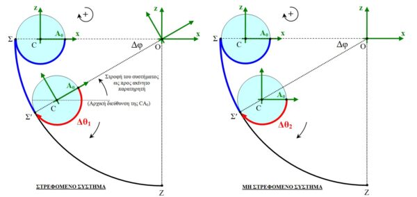 1) Στην περίπτωση του στρεφόμενου συστήματος και λόγω της στροφής του κατά Δφ, το σημείο αναφοράς Α0 του x άξονα θα είναι αντιδιαμετρικό του Σʹ. Έτσι, ο στρεφόμενος παρατηρητής θα μετρήσει ωρολογιακή γωνία στροφής του δίσκου: