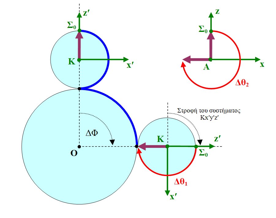 ο παρατηρητής του συστήματος Κx'y'z' βλέπει το Κ ακίνητο και τον κύλινδρο Ο να στρέφεται αντιωρολογιακά με γωνιακή ταχύτητα Ω = dΦ/dt, ενώ τον δίσκο τον βλέπει να στρέφεται ωρολογιακά με ω1 = dθ1/dt.