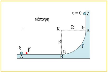 Σώμα μάζας m = 0,2 kg, βρίσκεται ακίνητο σε σημείο Α λείου οριζοντίου δαπέδου. Ασκούμε τη χρονική στιγμή t0 = 0, στο σώμα οριζόντια δύναμη F μέχρι το σημείο Β, όπου από κει και μετά υπάρχει λείο τεταρτοκύκλιο ΒΔ. Το σώμα μπαίνει στο τεταρτοκύκλιο με ταχύτητα μέτρου υ = 10 m/s και δέχεται από το κατακόρυφο λείο τοίχωμα δύναμη μέτρου F1 = π N. Το σώμα εξέρχεται από το τεταρτοκύκλιο τη στιγμή t2 = 6 s. Μετά το σημείο Δ υπάρχει τραχύ δάπεδο και το σώμα αφού διανύσει συνολική απόσταση από το σημείο Α 45 m σταματά στο σημείο Ζ. Στο διπλανό σχήμα βλέπουμε μία κάτοψη της διαδρομής του σώματος. Να βρεθούν: