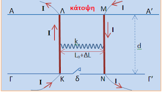 Στο σχήμα απεικονίζεται η κάτοψη κυκλώματος που αποτελείται από τα εξής στοιχεία: Αγωγούς ΑΑ΄ και ΓΓ΄αμελητέας αντίστασης που απέχουν μεταξύ τους d=1m , αγωγούς ΚΛ και ΜΝ μήκους d=1m αντίστασης R=2Ω ο καθένας τους, και μάζας m=0,5kg . Το ιδανικό ελατήριο φυσικού μήκους Lo=2,2cm, είναι σταθεράς k=20N/m, και συνδέεται με τα μέσα των ΚΛ και ΜΝ. Δεν έχουμε τριβές μεταξύ των ΚΛ, ΜΝ με τους ΑΑ΄ και ΓΓ΄. Αρχικά ο διακόπτης δ είναι ανοικτός . Διοχετεύουμε σε κάθε ένα από τους ΚΛ και ΜΝ αντίρροπα ρεύματα έντασης Ι=600 Α . Το ελατήριο επιμηκύνεται κατά ΔL και το σύστημα ισορροπεί. Θεωρείστε ότι ισχύει η σχέση που δίνει τη δύναμη Laplace μεταξύ παραλλήλων ρευματοφόρων αγωγών με πολύ μεγάλη προσέγγιση (d>>Lo).