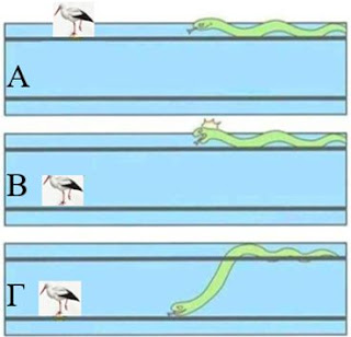 - Ένα φίδι, ανέβηκε στην κολώνα και ακολουθώντας το πάνω καλώδιο, πλησιάζει τον πελαργό για τον φάει, όπως στο Α σχήμα. Μόλις το αντιλαμβάνεται ο πελαργός, επειδή δεν θέλει να απομακρυνθεί, προτιμά να πετάξει και να αλλάξει απλά καλώδιο, μεταφερόμενος στον ουδέτερο (σχήμα Β). Τι να κάνει το φίδι, πρέπει και αυτό να αλλάξει καλώδιο και να μεταφερθεί στον ουδέτερο (σχήμα Γ). Τι λέτε είναι αυτή μια καλή ιδέα;