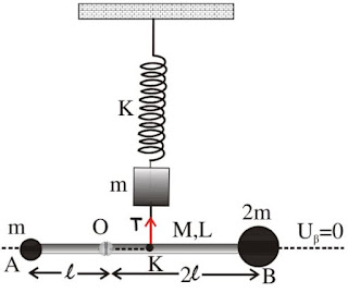 Η ράβδος μπορεί να περιστρέφεται χωρίς τριβές σε κατακόρυφο επίπεδο, γύρω από οριζόντιο άξονα που περνάει από το σημείο Ο. Το σημείο Ο απέχει από τις άκρες τις ράβδου αντίστοιχα αποστάσεις (ΟΑ)= και (ΟΒ)=2. Η ράβδος με τις μάζες ισορροπεί αρχικά στην οριζόντια θέση μέσω της τάσης που δέχεται από το νήμα. Το άλλο άκρο του νήματος είναι δεμένο με μάζα m η οποία με τη σειρά της είναι δεμένη σε κατακόρυφο ελατήριο σταθεράς Κ=300Ν/m, όπως φαίνεται στο σχήμα.