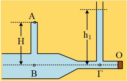 Στο σχήμα βλέπουμε ένα τμήμα δικτύου, το δεξιό άκρο Ο του οποίου κλείνεται με τάπα. Στον κεντρικό σωλήνα με μεταβλητή διατομή, έχουν προσαρμοσθεί δύο κατακόρυφοι λεπτοί σωλήνες, ο πρώτος κλειστός γεμάτος νερό, με ύψος Η=0,6m (από τον άξονα του σωλήνα), ενώ ο δεύτερος ανοικτός, όπου το νερό ανεβαίνει σε ύψος h1=0,8m (ξανά από τον άξονα του οριζόντιου σωλήνα). Η διατομή του σωλήνα στην περιοχή του σημείου Γ είναι Α1=1cm2, ενώ στην περιοχή του σημείου Β η αντίστοιχη διατομή είναι τετραπλάσια.