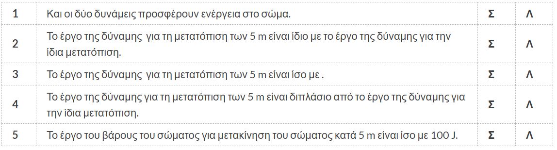 Ένα σώμα μάζας m = 2 kg (g = 10 m/s2) είναι ακίνητο σε λείο οριζόντιο επίπεδο και αρχίζει να κινείται με την επίδραση των δύο σταθερών δυνάμεων ίδιων μέτρων F1 = F2 που φαίνονται στο διπλανό σχήμα. Το μέτρο κάθε δύναμης είναι ίσο με το βάρος του σώματος. Το σώμα μετατοπίζεται κατά 5 m.