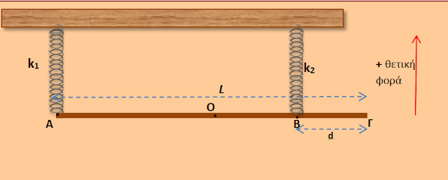 Η ράβδος μάζας m=3kg και L=1m ισορροπεί οριζόντια, προσαρτημένη στα σημεία Α και Β από ιδανικά ελατήρια ίδιου φυσικού μήκους lo, με σταθερές k1=25N/m και k2=50N/m , που τα άλλα τους άκρα είναι δεμένα στην οροφή. Μετατοπίζουμε αργά τη ράβδο προς τα κάτω κατά A=0.2m, διατηρώντας την οριζόντια, και τη χρονική στιγμή t=0 την αφήνουμε ελεύθερη να κινηθεί. Δίνεται g=10 m/s2 .