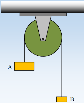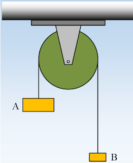 Η τροχαλία του σχήματος ακτίνας R=0,2m και μάζας Μ=3,5kg μπορεί να στρέφεται χωρίς τριβές, γύρω από σταθερό οριζόντιο άξονα ο οποίος περνά από το κέντρο της Ο. Περνάμε ένα μη εκτατό και αβαρές νήμα από το αυλάκι (ελάχιστου βάθους…) της τροχαλίας και στα άκρα του δένουμε δύο σώματα Α και Β με μάζας m1=0,2kg και m2=0,1kg, τα οποία αφήνουμε να κινηθούν, από τις θέσεις που φαίνονται στο σχήμα. Αν το σώμα Α πέφτει με επιτάχυνση α1=1m/s2, να βρεθούν: