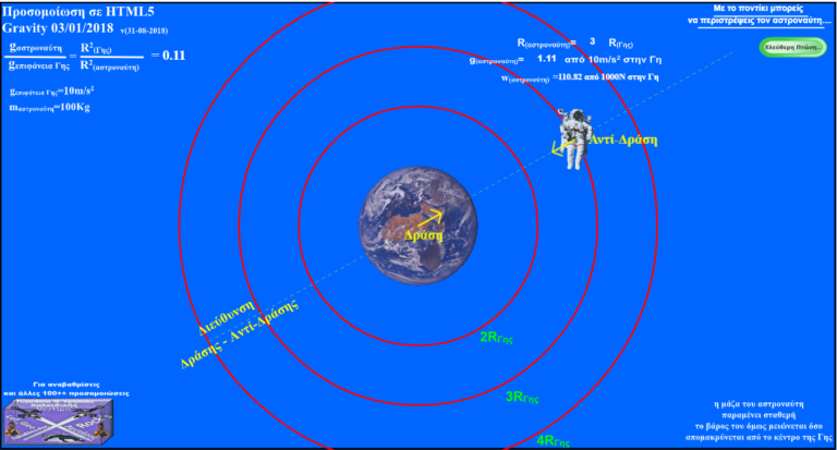 Προσομοίωση HTML5 ……<<Η κόκκινη σφαίρα είναι στο πλανήτη Γη ενώ η πράσινη σφαίρα στον πλανήτη που μπορούμε να διαλέξουμε εμείς ( εδώ είναι στον πλανήτη Άρη). Βλέπουμε πως στην Γη η σφαίρα πέφτει πιο γρήγορα. Επίσης ένας άνθρωπος 80 κιλών ,η ζυγαριά στον πλανήτη Άρη θα τον δείχνει περίπου 29.6 κιλά.  Την 1η έκδοση του προγράμματος την έκανα το 2014 σε adobe flash . To 2018 την μετέτρεψα σε HTML5 . Λόγω του μεγέθους της δεν κατάλαβα (και γενικά δεν το έψαξα) πως είχε πρόβλημα ”εμφάνισης” στα κινητά και τα tablet . Όποτε τώρα νομίζω πως ‘’τρέχει’’ παντού
