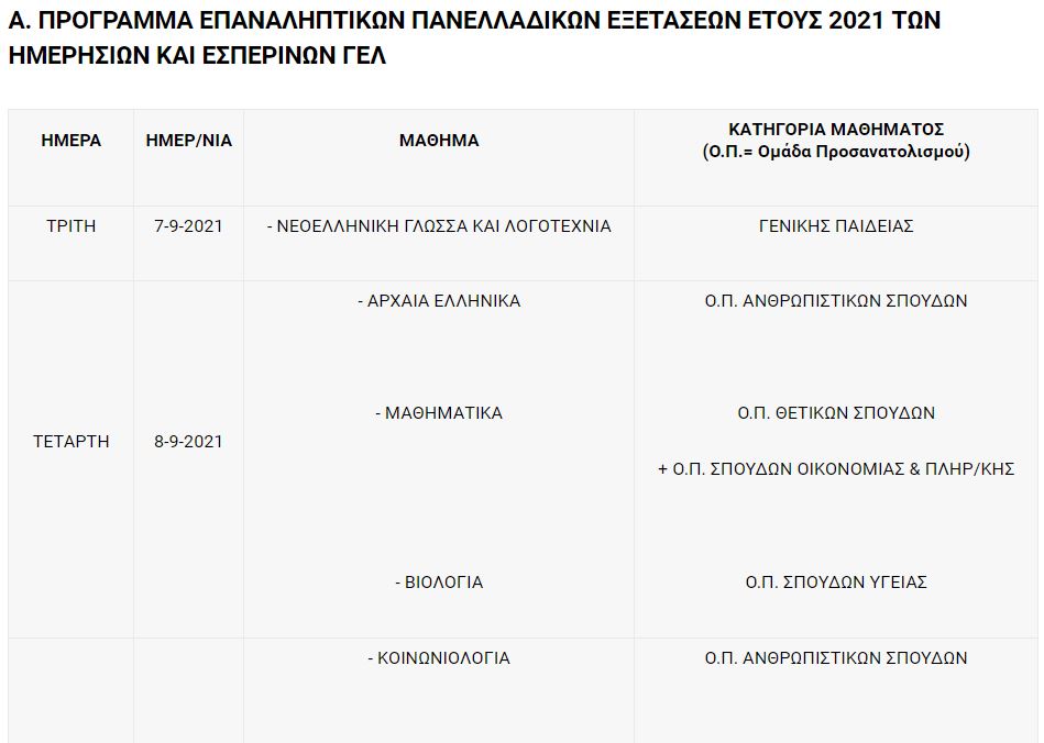 Σύμφωνα με το πρόγραμμα του Υπουργείου Παιδείας οι επαναληπτικές εξετάσεις ξεκινάνε στις 7 Σεπτεμβρίου και ολοκληρώνονται στις 21 του ίδιου μήνα με τα ειδικά μαθήματα.