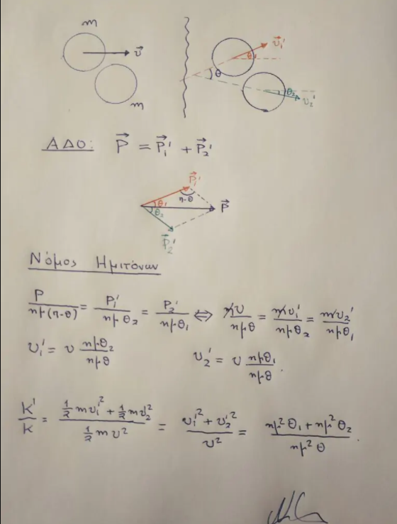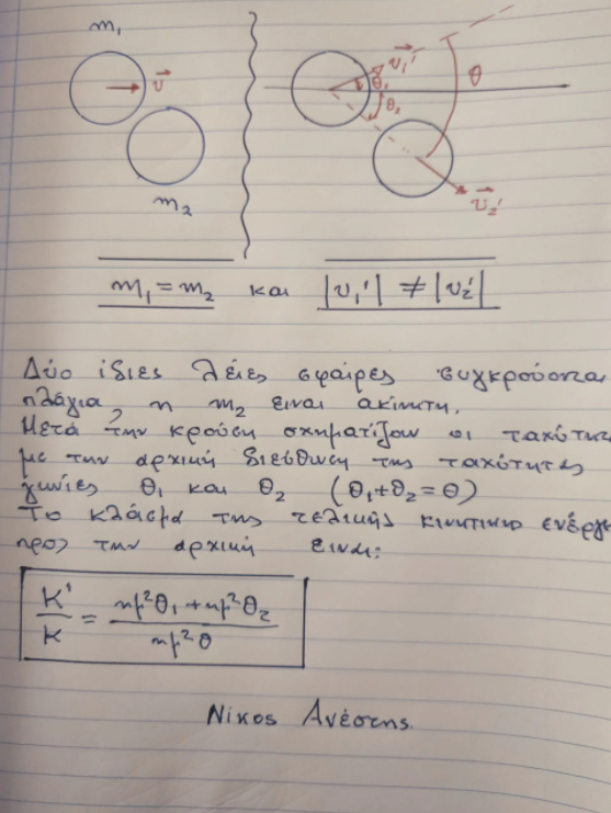 Όμορφη Νίκο, ευχαριστούμε. Να πούμε πως αν οι θι,θ2 είναι συμπληρωματικές η κρούση είναι ελαστική ημ^2(θ1)+ημ^2(θ2)=ημ^2(θ)