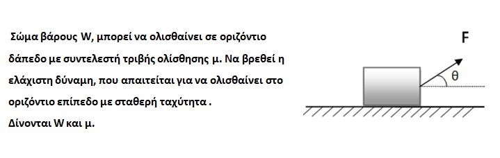 θα θεωρούσα, αρχικά, τις δύο “ακραίες” περιπτώσεις: η ζητουμένη δύναμη είναι οριζόντια οπότε είναι ίση με … μw ή είναι κατακόρυφη οπότε είναι ίση με … w