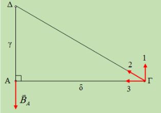 iii) Αν το μέτρο της έντασης του πεδίου στην κορυφή Α είναι ΒΑ=6∙10-4 Τ, να βρείτε το μέτρο της έντασης στην κορυφή Δ του τριγώνου και να την σχεδιάσετε πάνω στο σχήμα. Να προσδιορίσετε τη διεύθυνση της ΒΔ, υπολογίζοντας το ημθ της γωνίας θ που σχηματίζει το διάνυσμα ΒΔ με την πλευρά ΔΑ του τριγώνου