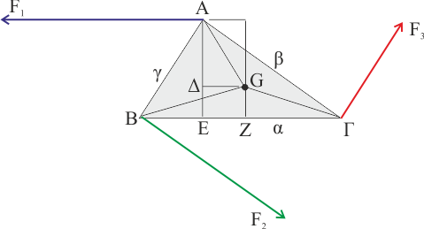 Η ροπή της κάθε δύναμης ως προς το κέντρο μάζας θα είναι η δύναμη (πλευρά τριγώνου) επί την απόσταση του κέντρου μάζας από την πλευρά του τριγώνου, που λόγω θεωρήματος Θαλή (σημείο τομής διαμέσων) θα ισούται με τα 2/3 του αντίστοιχου ύψους. Το γινόμενο όμως αυτό δεν είναι παρά τα 2/3 του εμβαδού του τριγώνου. Έτσι όλες οι δυνάμεις έχουν την ίδια ροπή ως προς το κέντρο μάζας και η συνολική ροπή τριπλάσια της μιας. Το ύψος πχ από το Α ισούται με γημΒ=βημΓ.