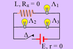 Στο κύκλωμα οι λαμπτήρες Λ1, Λ2, Λ3 είναι όμοιοι. Η πηγή έχει ΗΕΔ Ε και εσωτερική αντίσταση r = 0. το πηνίο είναι ιδανικό τα καλώδια σύνδεσης δεν παρουσιάζουν αντίσταση. Την t0 = 0 κλείνουμε το διακόπτη. Τη στιγμή που ο ρυθμός αύξησης της ενέργειας του μαγνητικού πεδίου του πηνίου είναι dUL/dt = E2/4R όπου R η αντίσταση κάθε λαμπτήρα τότε:
