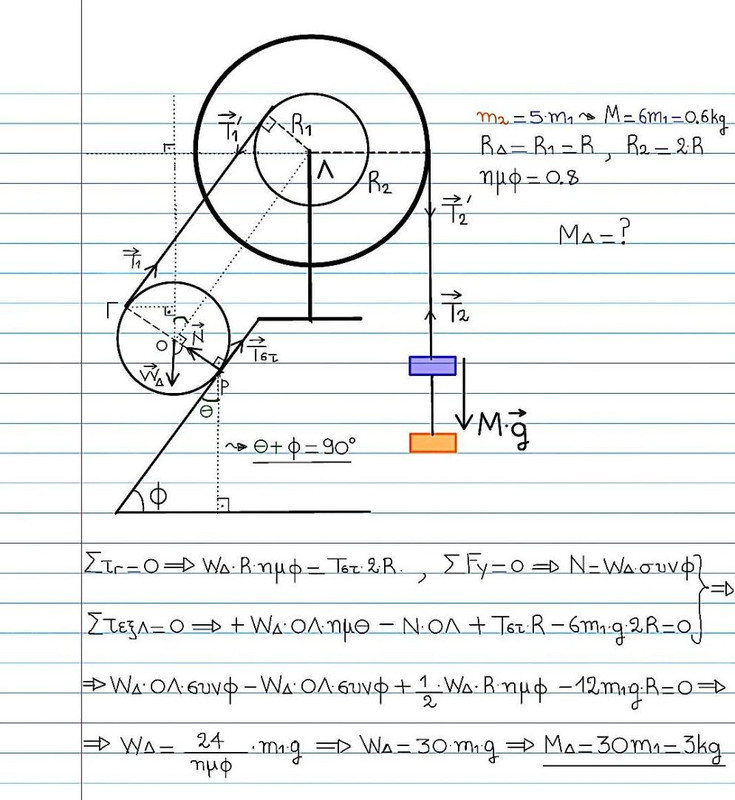 Για το διπλανό σχήμα δίνεται ότι, η διάταξη είναι κατακόρυφη, όλα τα νήματα είναι αβαρή και μη εκτατά, το κεκλιμένο επίπεδο είναι τραχύ με γωνία κλίσης φ όπου ημφ = 08. Η διπλή τροχαλία αποτελείται από δύο ομοαξονικούς δίσκους με ακτίνες R1 = R και R2 = 2R και μπορεί να στρέφεται χωρίς τριβές γύρω από τον άξονα της. Το νήμα (1) είναι κατακόρυφο και τυλιγμένο πολλές φορές σε ένα λεπτό αυλάκι του εξωτερικού δίσκου της τροχαλίας και το άλλο του άκρο είναι δεμένο στο σώμα Σ1. Το νήμα (2) είναι παράλληλο στο κεκλιμένο επίπεδο, τυλιγμένο πολλές φορές σε ένα λεπτό αυλάκι του εσωτερικού δίσκου της τροχαλίας και το άλλο το άκρο είναι τυλιγμένο στην περιφέρεια του δίσκου που έχει λεπτό αυλάκι και ακτίνα RΔ = R. Το νήμα (3) ανήκει στην ίδια κατακόρυφο με το νήμα (1) και συνδέει το σώμα Σ1 με το σώμα Σ2. Αρχικά όλα τα σώματα του συστήματος ισορροπούν ακίνητα.