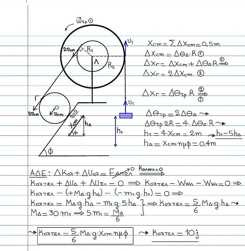 β. Τη στιγμή που δίσκος θα έχει μετατοπιστεί κατά xcm,Δ = 0,5 m, να βρεθεί η κινητική ενέργεια του συστήματος δίσκος – τροχαλία – σώμα Σ1.