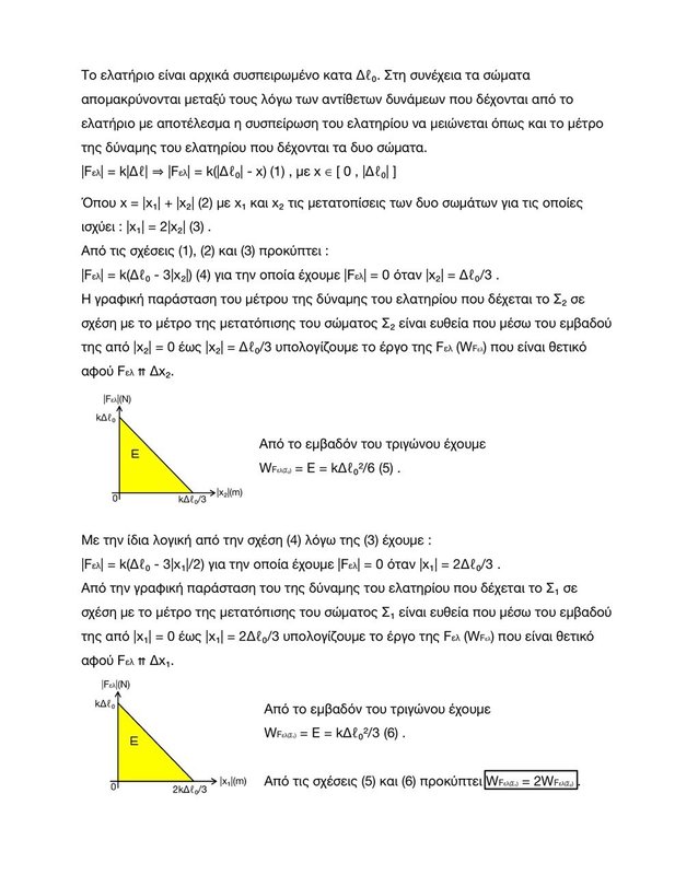 Γεια σου Μίλτο προσπάθησα να βρω την Fελ που δέχεται κάθε σώμα από το ελατήριο σε σχέση με την μετατόπιση του αφού είδα το σχόλιο του Χρήστου Αγριόδημα και κατέληξα κάπου. Μπορεί να κάνω λάθος. Στην λύση για τον υπολογισμό του έργου της Fελ που δέχεται κάθε σώμα από το ελατήριο παίρνω ως δεδομένο ότι ισχύει x₁ = 2x₂.