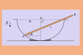 Η λεπτή ράβδος ΑΒ μήκους L = 2R βρίσκεται ακίνητη μέσα σε μια ημισφαιρική λεκάνη ακτίνας R σχηματίζοντας με την οριζόντια διεύθυνση γωνία θ = 300. Τριβές αμελούνται. Να βρεθεί η θέση του κέντρου μάζας της ράβδου.