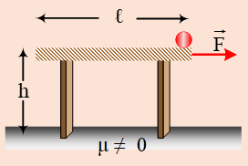 Πάνω στην οριζόντια επιφάνεια του τραπέζιού που έχει μήκος ℓ = 1 m ύψος h = 0,8 m και μάζα Μ = 12 kg βρίσκεται μικρή σφαίρα μάζας m = 3 kg στην δεξιά άκρη του (σχήμα). Τριβές μεταξύ σφαίρας και επιφάνειας τραπεζιού αμελούνται. Ο συντελεστής τριβής μεταξύ τραπεζιού και οριζόντιας επιφάνειας δαπέδου είναι μ = 0,2 και g = 10 m/s2. Αρχικά τραπέζι και σφαίρα είναι ακίνητα την t0 = 0 ασκούμε στο τραπέζι δύναμη F = 54 Ν οριζόντια (σχήμα). Να βρεθεί η μετατόπιση του τραπεζιού της στιγμή που η σφαίρα πέφτει στο δάπεδο. (Το τραπέζι εκτελεί μεταφορική κίνηση).