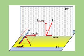 Τα επίπεδα Ε1 και Ε2 είναι κάθετα μεταξύ τους με το Ε1 οριζόντιο. Η μεταλλική ράβδος μήκους L είναι πάνω στο Ε1 και κάθετη στο Ε2 ενώ κινείται με ταχύτητα υ που σχηματίζει γωνία θ με τον άξονα της ράβδου, πάνω στο Ε1.