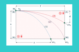 Ένα ηλεκτρόνιο (, −) εισέρχεται από το σημείο (), σε ομογενές μαγνητικό πεδίο έντασης η εγκάρσια τομή του οποίου είναι το ορθογώνιο , διαστάσεων , . Η ταχύτητα ⃗ του ηλεκτρονίου είναι κάθετη στις δυναμικές