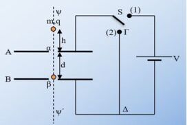 Δύο παράλληλες επίπεδες μεταλλικές πλάκες Α και Β (πυκνωτής), απέχουν μεταξύ τους απόσταση d και τοποθετούνται οριζόντια, όπως φαίνεται στο σχήμα. Μέσω του μεταγωγικού διακόπτη S, δημιουργούμε κύκλωμα, στο οποίο μπορεί να συνδέεται η πηγή τάσης V ή ο αγωγός ΓΔ. Δυο μικρές τρύπες α και β έχουν ανοιχτεί στο κέντρο κάθε πλάκας, έτσι ώστε να βρίσκονται στην ίδια κατακόρυφο ψ΄ψ. Ένα φορτισμένο σωματίδιο μάζας m και φορτίου q ξεκινώντας από την ηρεμία σε ύψος h πάνω από την πλάκα Α, πέφτει ελεύθερα στη διεύθυνση της κατακορύφου ψ΄ψ, περνώντας από την τρύπα α. Πριν φτάσει στην τρύπα β η ταχύτητά του μηδενίζεται και το σωματίδιο επιστρέφει προς τα πάνω. Δίνεται το g.